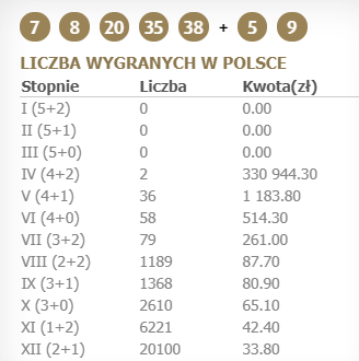 Liczbami ostatnio wylosowanymi sÄ…: 7, 8, 20, 35, 38 oraz 5, 9. Przypomnijmy, że 10 maja padÅ‚a w Polsce gÅ‚ówna wygrana w Eurojackpot w rekordowej wysokoÅ›ci ponad 193 mln zÅ‚otych.