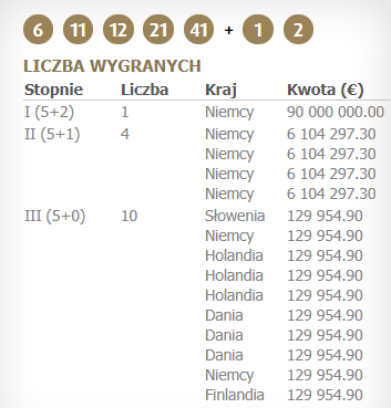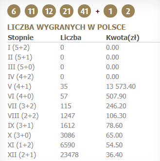 Przypomnijmy, że w puli na wygrane I i II stopnia w piątkowym losowaniu uzbierało się ponad 0,5 miliarda złotych (rekordowe 410 mln zł oraz 105 mln zł), a w Polsce odnotowaliśmy ponad 36 tysięcy wygranych niższych stopni.