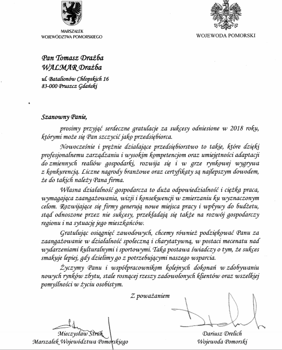 W marcu Walerian Drażba za rozwój firmy uhonorowany został Włócznią Jaćwingów, Nagrodą Prezydenta Suwałk. Kilka dni temu jego syn, Tomasz, prowadzący oddział firmy Walmar Drażba w Pruszczu Gdańskim odebrał list gratulacyjny od Marszałka oraz Wojewody Pomorskiego.
