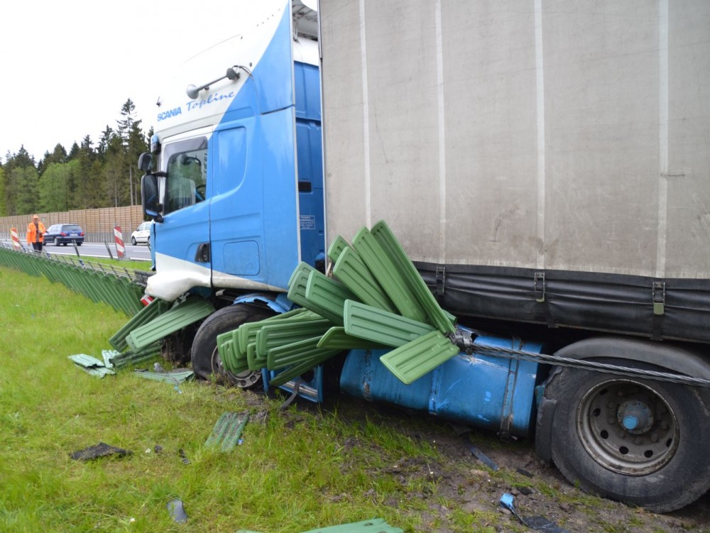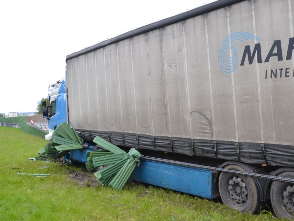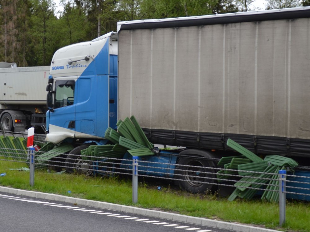 Stalowe liny i barierki oddzielające dwa pasy jezdni uchroniły kierowcę ciężarowej scanii od zderzenia z samochodami nadjeżdżającymi z naprzeciwka.