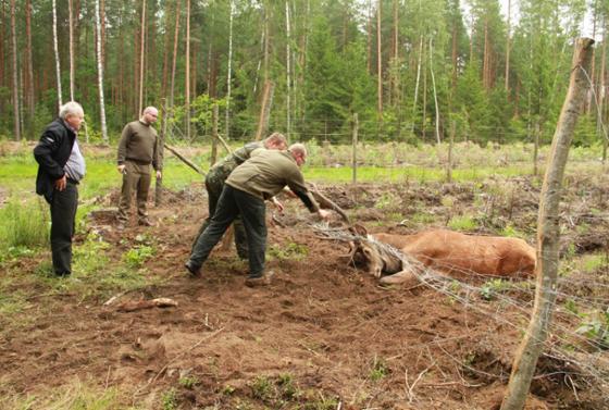 Na miejscu okazało się, że w plątaninie drutu znajduje się młody, bo około pięcioletni, byk z bardzo okazałym porożem, jak fachowo określają leśnicy - w formie dwudziestaka obustronnie koronnego. Ślady wskazywały, że nie spędził tam dużo czasu.