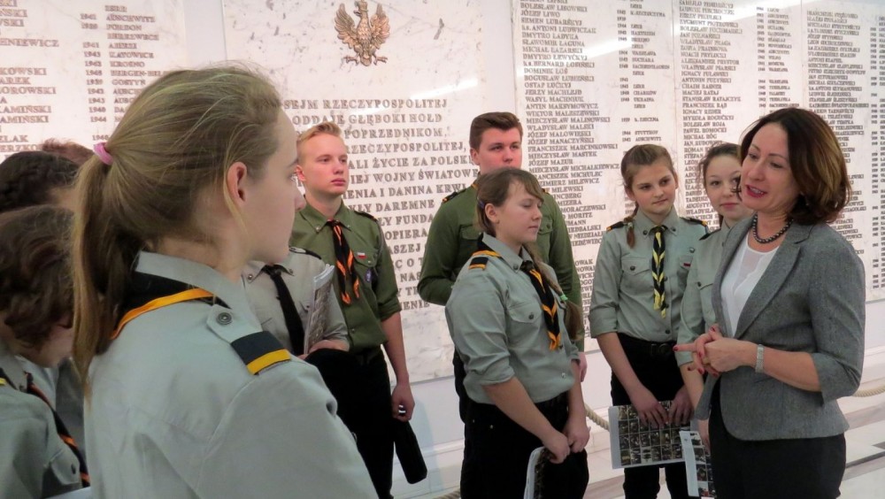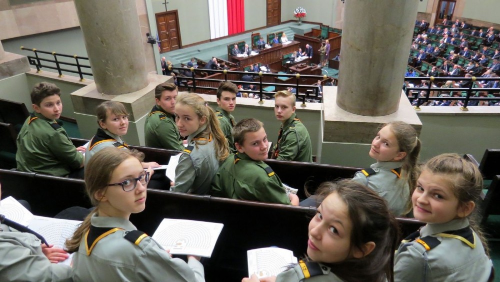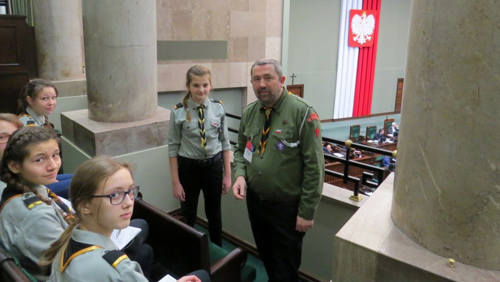 Podczas zwiedzania parlamentu mÅ‚odzi ludzie wysÅ‚uchali prelekcji sejmowego przewodnika o historii parlamentaryzmu w Polsce, trybie przyjmowania ustaw oraz trójpodziale wÅ‚adzy w naszym kraju. Mieli tez okazjÄ™ z loży sejmowej obserwować moment rozpoczÄ™cia obrad oraz przez kilkadziesiÄ…t minut przysÅ‚uchiwać siÄ™ im od czasu do czasu wyÅ‚awiajÄ…c wzrokiem postać jakiegoÅ› znanego z telewizji posÅ‚a. Harcerze spotkali premier BeatÄ™ SzydÅ‚o, która z chÄ™ciÄ… przystaÅ‚a na propozycjÄ™ zrobienia wspólnej, pamiÄ…tkowej fotografii. W jednym z biur Klubu Parlamentarnego Platforma Obywatelska, do którego zaprosiÅ‚a ich Bożena KamiÅ„ska, dziewczÄ™ta i chÅ‚opcy poznali warunki pracy posÅ‚ów oraz porozmawiali z posÅ‚ankÄ… o jej parlamentarnej dziaÅ‚alnoÅ›ci.
