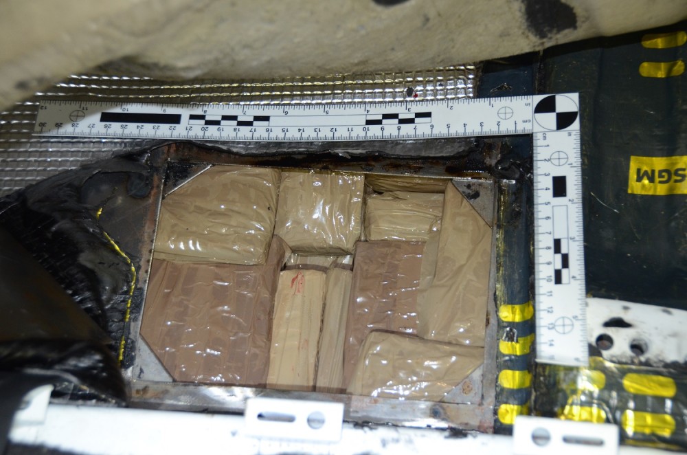 W progach, nadkolach tylnych oraz podłodze samochodu ujawniono 135 zamkniętych hermetycznie paczek z suszem roślinnym. Użyty tester narkotyczny wykazał, że jest to haszysz. Zabezpieczony towar to ponad 104 kg haszyszu o wartości ponad 3 mln zł.