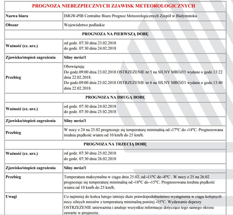 PotwierdzajÄ… siÄ™ wczeÅ›niejsze prognozy biaÅ‚ostockich synoptyków z IMGW-PIB o fali mrozów, nadciagajÄ…cej znad Syberii. Na wÅ‚asnej skórze odczuwamy, że robi siÄ™ coraz zimniej i musimy przyzwyczaić siÄ™, że taki stan trochÄ™ potrwa. IMGW–PIB wydaje ostrzeżenia o silnych mrozach, nazywa je niebezpiecznymi zjawiskami.