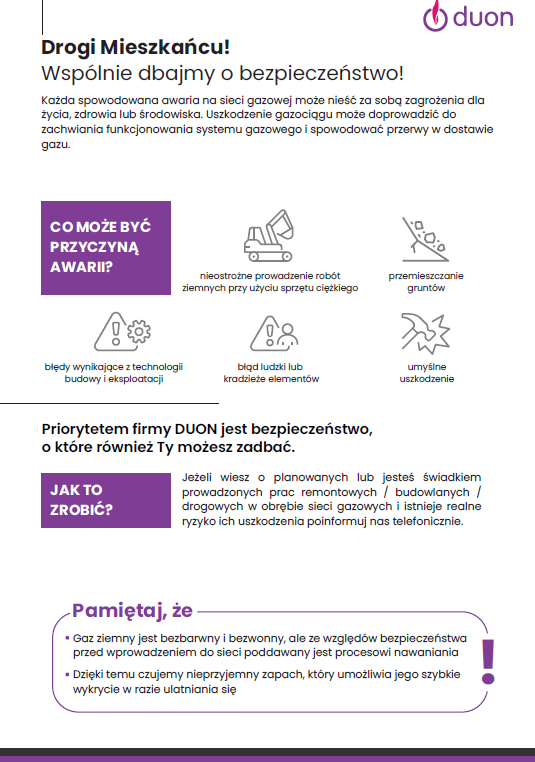 – Bezpieczeństwo oraz stabilność dostaw gazu to dla nas absolutnie kluczowa kwestia, dlatego zależy nam, by je zapewnić wszelkimi możliwymi sposobami. Jeżeli wiedzą Państwo o planowanych lub prowadzonych pracach remontowych / budowlanych / drogowych w obrębie sieci gazowych i widzą lub podejrzewają realne zagrożenie ich uszkodzenia – prosimy o kontakt. Jesteśmy dla Państwa dostępni pod numerem telefonu 725 250 250 w trybie 24 h przez 7 dni w tygodniu. Przyjrzymy się każdemu zgłoszeniu. Będziemy wdzięczni za wszelkie sygnały z Państwa strony – zwraca się do mieszkańców przedstawiciel Duon.