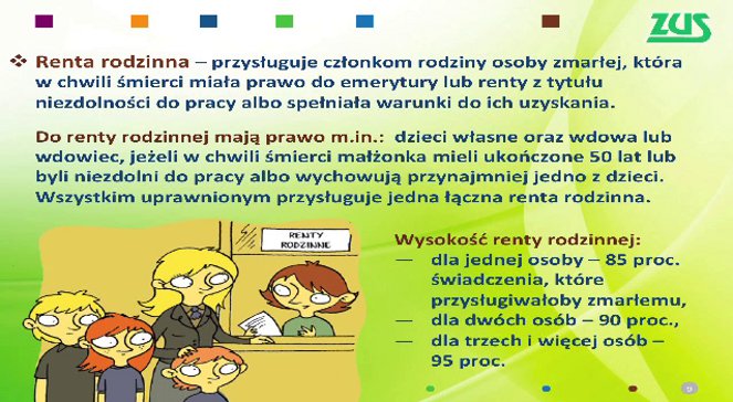 Renta rodzinna przysługuje bliskim zmarłego, jeśli był on emerytem, rencistą lub spełniał warunki wymagane do uzyskania jednego z tych świadczeń, albo pobierał zasiłek przedemerytalny lub świadczenie przedemerytalne. Rentę tę mogą dostać m.in.: dzieci ubezpieczonego zmarłego, dzieci jego małżonka lub te przysposobione. Prawo do renty rodzinnej mają również wnuki, rodzeństwo i inne dzieci przyjęte na wychowanie (przed osiągnięciem przez nie pełnoletności), co najmniej na rok przed śmiercią ubezpieczonego, chyba, że była ona skutkiem wypadku. Rentę dostaną jednak tylko wówczas, jeśli nie otrzymują jej po rodzicach albo ci ostatni nie są w stanie ich utrzymać. Prawo to będą miały także wtedy, gdy zmarły lub jego małżonek zostali ustanowieni ich opiekunami prawnymi.