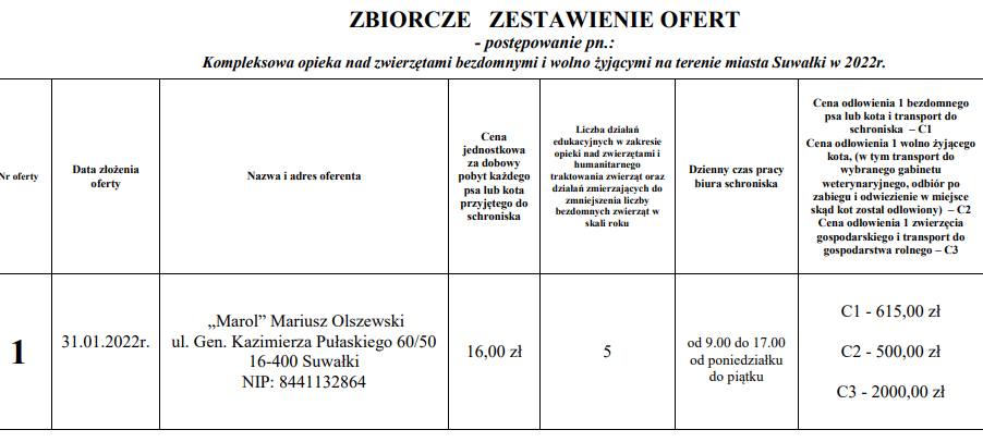 We wtorek, 1 lutego nastąpiło otwarcie ofert w przetargu na „Kompleksową opiekę nad zwierzętami bezdomnymi i wolno żyjącymi na terenie miasta Suwałki”.
