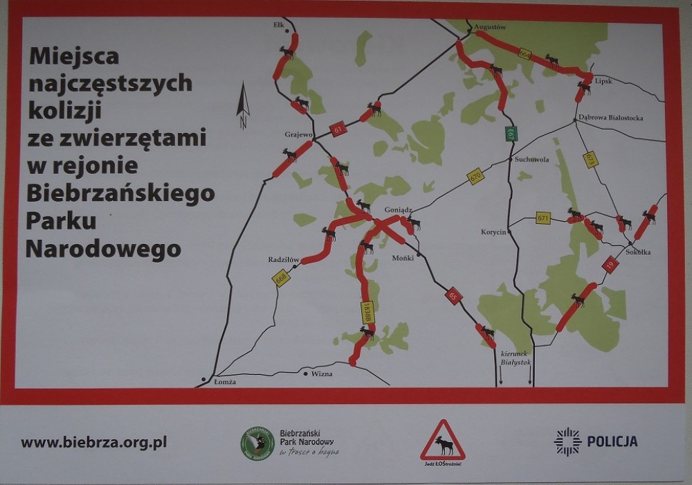 Zatrzymywani kierowcy otrzymywali naklejki na samochód z wizerunkiem łosia i hasłem „Jedź ŁOŚtrożnie!". Dodatkowo pracownicy parku wręczali im mapki z wyszczególnionymi miejscami najczęstszych kolizji ze zwierzętami w rejonie Biebrzańskiego Parku Narodowego.