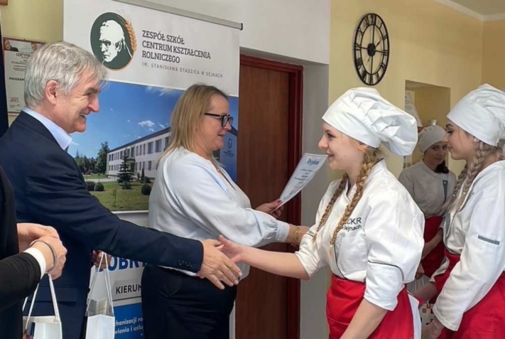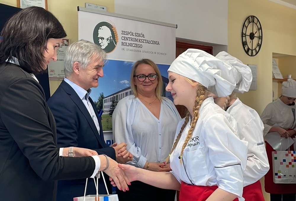 Komisja konkursowa w skÅ‚adzie: dyrektor szkoÅ‚y Dorota Tomczyk, zastÄ™pca dyrektora Departamentu Rolnictwa i Rozwoju Obszarów Wiejskich Iwona Krzyżanowska, kierownik praktycznej nauki zawodu Zbigniew Doroszko i Anna Miszkiel, przewodniczÄ…ca KGW Marycha w Posejnelach, wysoko oceniÅ‚a przygotowane potrawy.