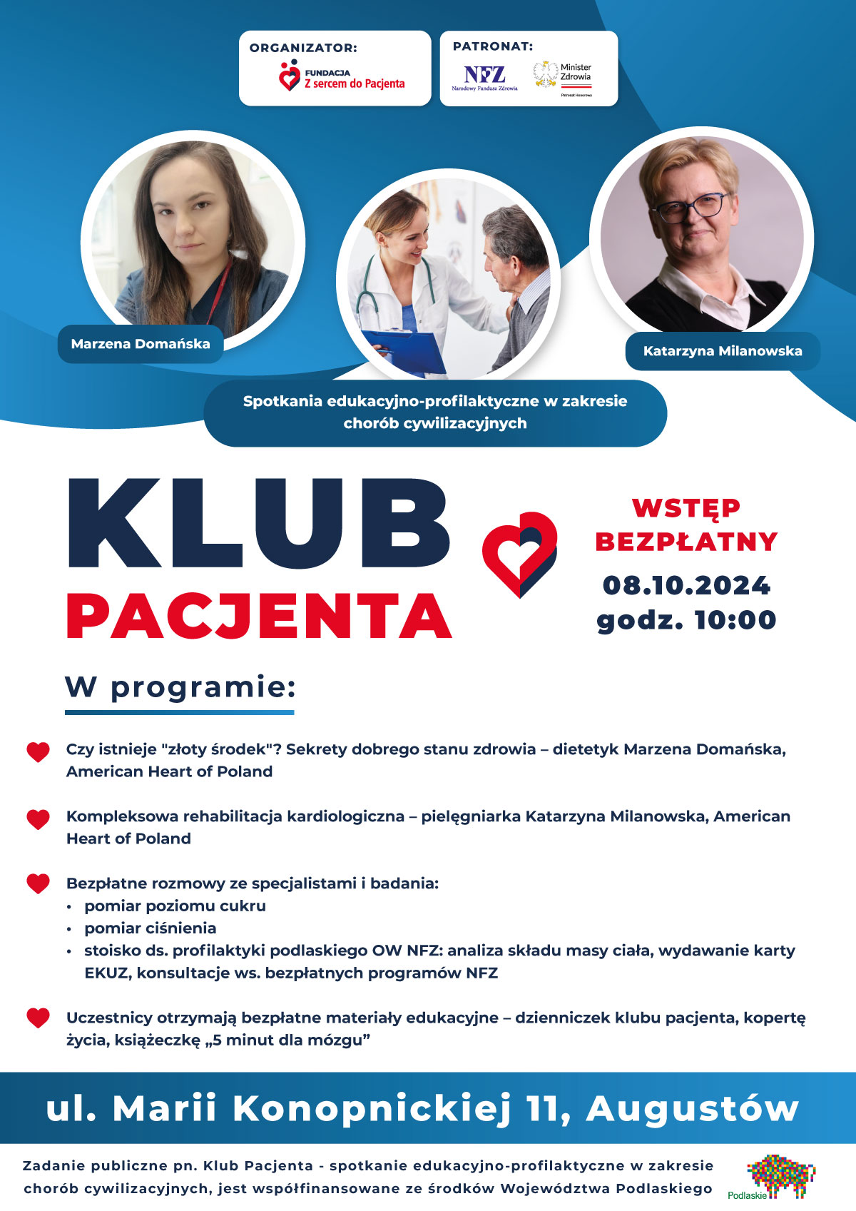 „Zadanie publiczne pn. Klub Pacjenta- spotkanie edukacyjno-profilaktyczne w zakresie chorób cywilizacyjnych jest wspóÅ‚finansowane przez Województwo Podlaskie”.