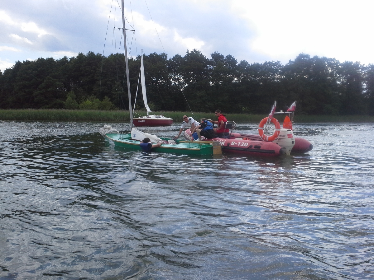 Po dopÅ‚yniÄ™ciu do żaglówki okazaÅ‚o siÄ™, że w wodzie znajduje siÄ™ pięć osób i ...pies! Jak siÄ™ okazaÅ‚o nie wszyscy byli w kamizelkach asekuracyjnych. Ratownicy i policjanci wyciÄ…gnÄ™li wszystkich na pokÅ‚ad swoich Å‚odzi i bezpiecznie przetransportowali na brzeg. NastÄ™pnie postawili OmegÄ™, wylali wodÄ™ i odholowali żaglówkÄ™ do brzegu.