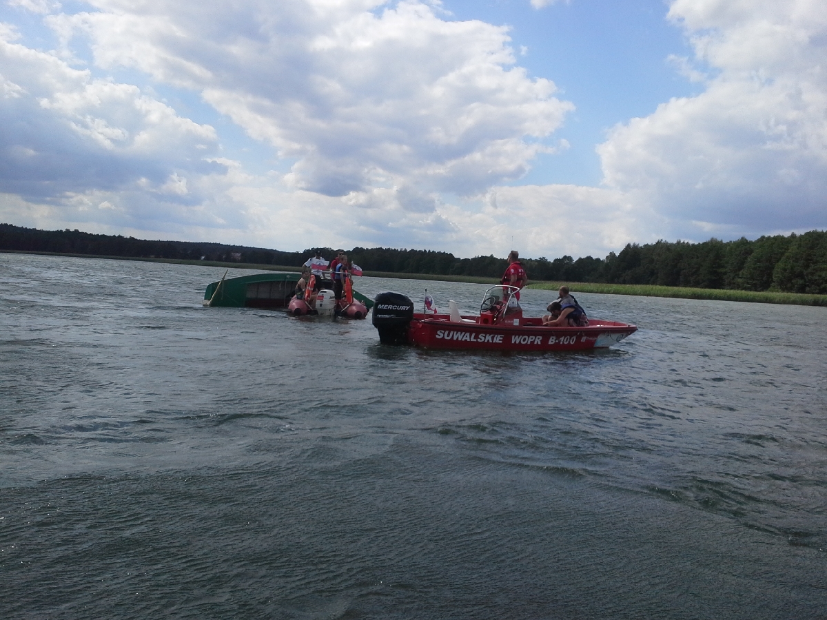 W sobotę około godziny 14.00 ratownicy Suwalskiego WOPR podczas wspólnego patrolu prewencyjnego z fun8kcjonariuszami Komendy Miejskiej Policji w Suwałkach na jeziorze Wigry w okolicy Półwyspu Klasztornego zauważyli przewróconą łódź. Natychmiast podjęto akcję ratowniczą.