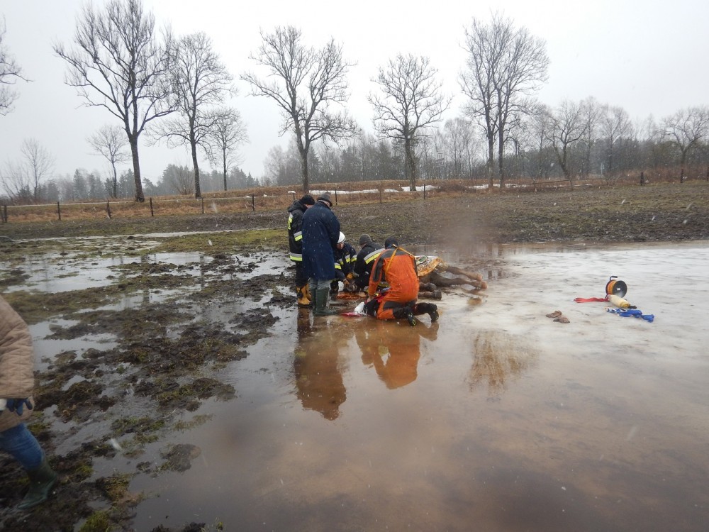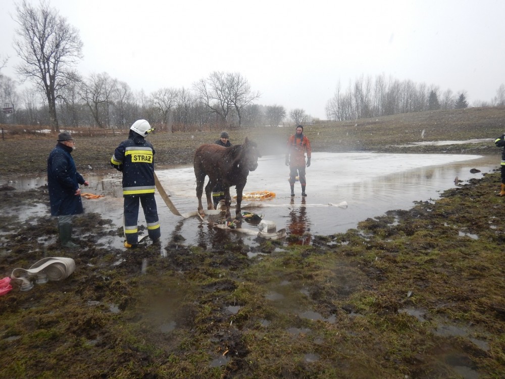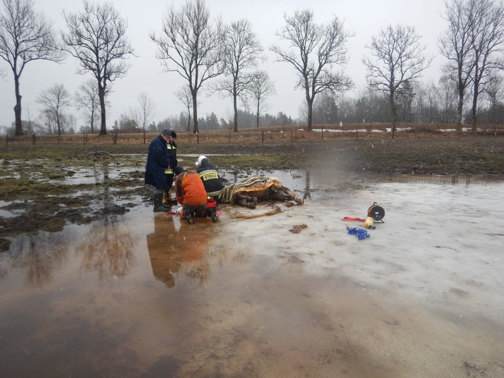 Ośmiu strażaków brało udział w akcji ratowania konia, który nie mógł wydostać się ze stawu w miejscowości Błąkały koło Gołdapi. Zwierzę było wycieńczone i nie mogło wstać.