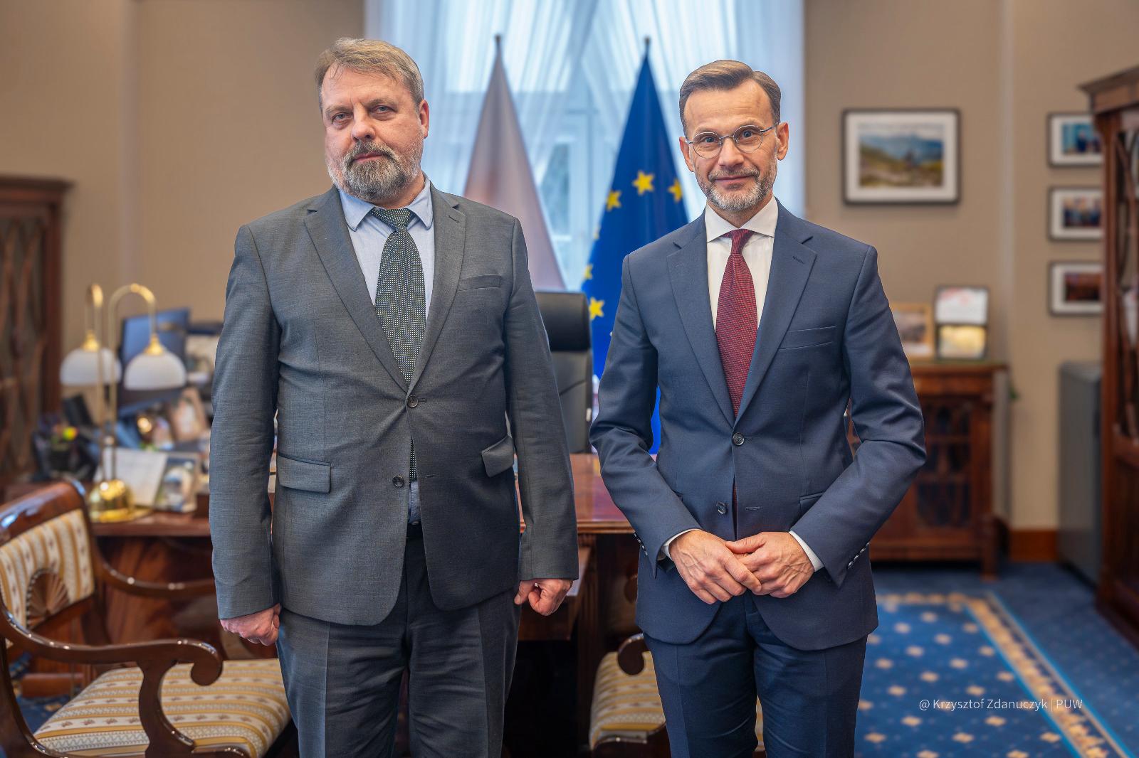 - Dziękuję za wizytę w Podlaskim Urzędzie Wojewódzkim i interesującą rozmowę o polsko-litewskiej współpracy nowemu konsulowi Republiki Litewskiej w Sejnach Mindaugasowi Butkusowi oraz towarzyszącemu mu sekretarzowi konsulatu Petrasowi Maksimavičiusowi. Sejneńszczyzna to szczególny zakątek województwa podlaskiego, gdzie od wieków żyją obok siebie Polacy i Litwini, a ślady wspólnej przeszłości znajdujemy na każdym kroku. W 2026 roku 200-lecie będzie świętować seminarium duchowne w Sejnach, instytucja ważna dla katolików obu nacji. Mam nadzieję, że zobaczymy się w Sejnach z Panem Konsulem i przedstawicielami litewskiej mniejszości na okolicznościowych uroczystościach – powiedział po spotkaniu wojewoda Jacek Brzozowski.