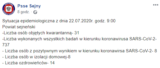W sumie na SejneÅ„szczyźnie od poczÄ…tku pandemii zostaÅ‚y zakażone 22 osoby, spoÅ›ród któych 14 już wyzdrowiaÅ‚o. SÅ‚użbom sanitarnym udaÅ‚o siÄ™ wygasić najwiÄ™ksze ognisko, jakie wybuchÅ‚o po przeprowadzonym 6 czerwca weselu w Gibach. Wówczas zachorowali m.in. radna tej gminy, wójt Gib z żonÄ… i dziećmi oraz jego rodzina w SuwaÅ‚kach, urzÄ™dnicy sejneÅ„skiego ratusza i Starostwa Powiatowego w Sejnach.