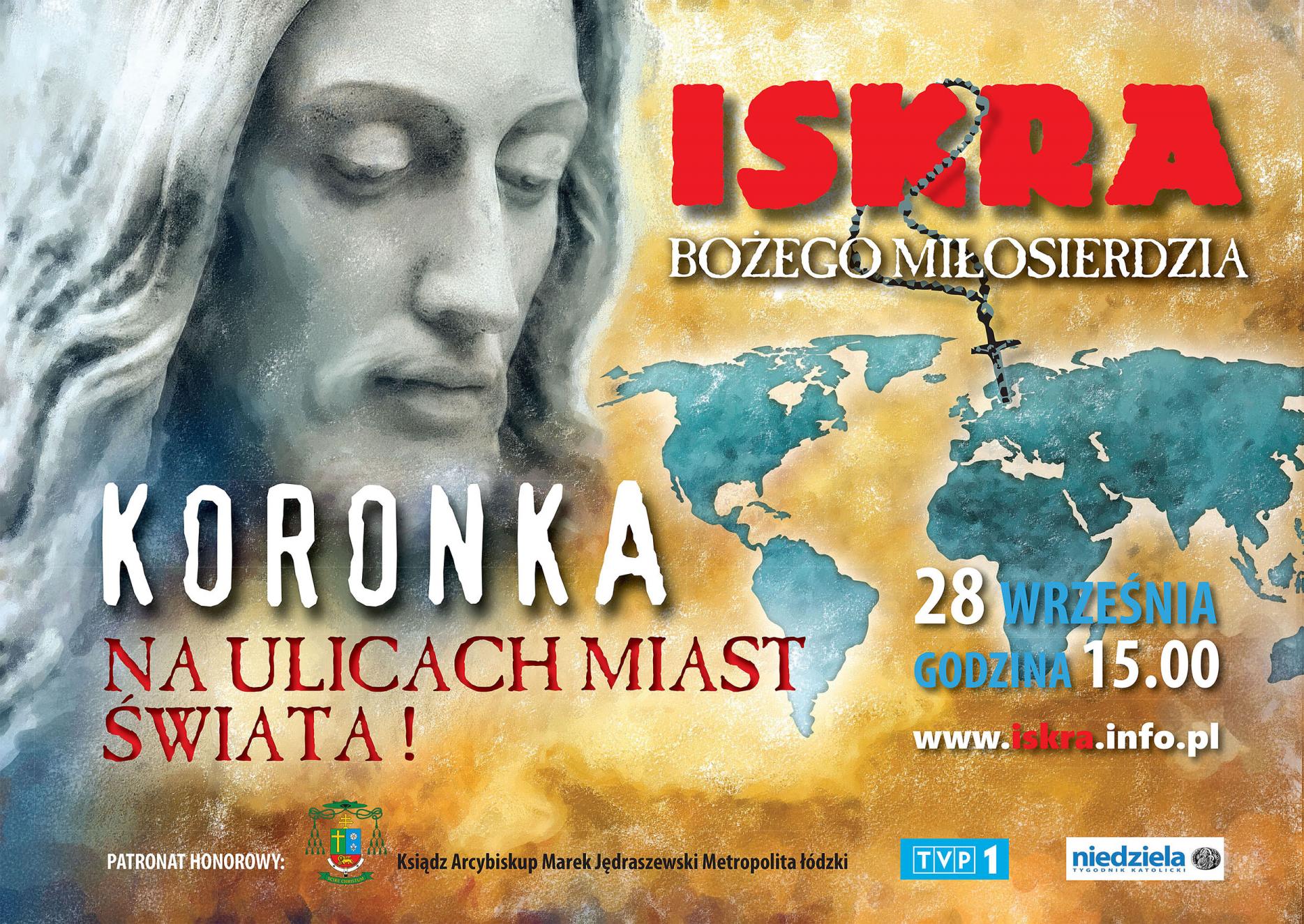 "Już szósty rok, tego samego dnia i o tej samej porze na rogach ulic zatÅ‚oczonych miast, uÅ›pionych miasteczek i wiejskich rozdrożach, bÄ™dziemy prosić Boga o miÅ‚osierdzie dla nas i caÅ‚ego Å›wiata. Pragniemy, aby poprzez tÄ™ modlitwÄ™ dać Å›wiadectwo wielkiej mocy Bożego MiÅ‚osierdzia. Modlimy siÄ™ także w intencjach, które niepokojÄ… nasze lokalne spoÅ‚ecznoÅ›ci. Idea odmawiania Koronki na ulicach i skrzyżowaniach naszych miast to przypominanie Å›wiatu o przesÅ‚aniu Bożego MiÅ‚osierdzia." - czytamy na stronie internetowej http://www.iskra.info.pl poÅ›wiÄ™conej m.in. "Koronce na ulicach Å›wiata".