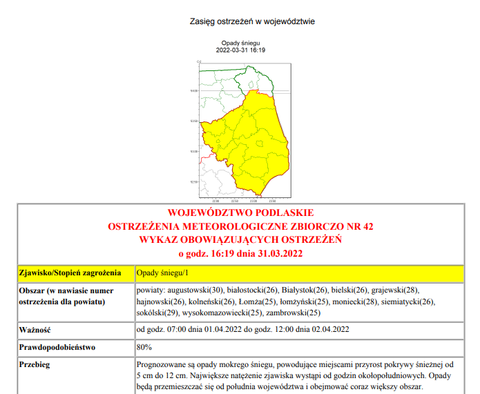 Ostrzeżenia o opadach mokrego śniegu od godz. 7 w piątek, 1 kwietnia do godz. 12 w sobote, 2 kwietnia wydało białostockie Biuro Prognoz Meteorologicznych IMGW-PIB. Opady mają przemeisczać się od południa województwa podlaskiego i obejmować coraz większy obszar.