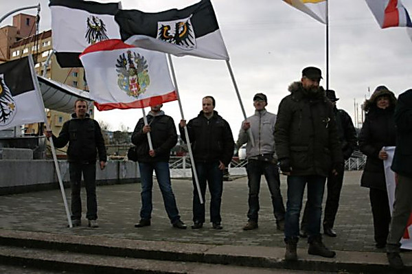 Na fot: Kaliningradzcy demonstranci pod pruską flagą, plakat w języku litewskim w Kaliningradzie. Fot. Newkalinngrad ru; BALTNEWS.lt