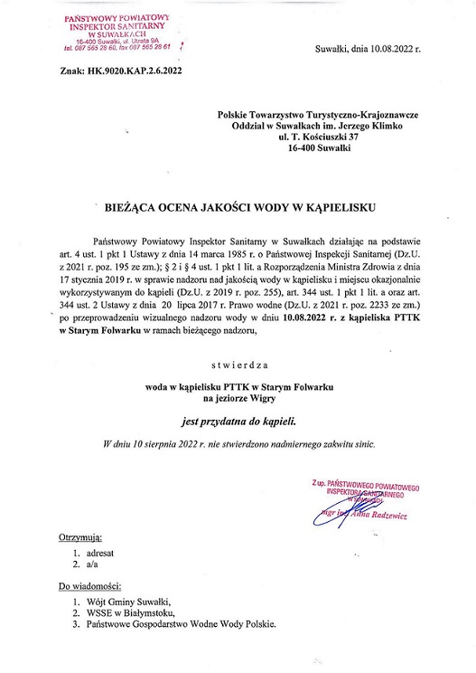 W środę, 10 sierpnia, Państwowy Powiatowy Inspektorat Sanitarny na podstawie oceny jakości wód stwierdził, że woda w kąpielisku PPTK w Starym Folwarku w jeziorze Wigry jest przydana do kąpieli.