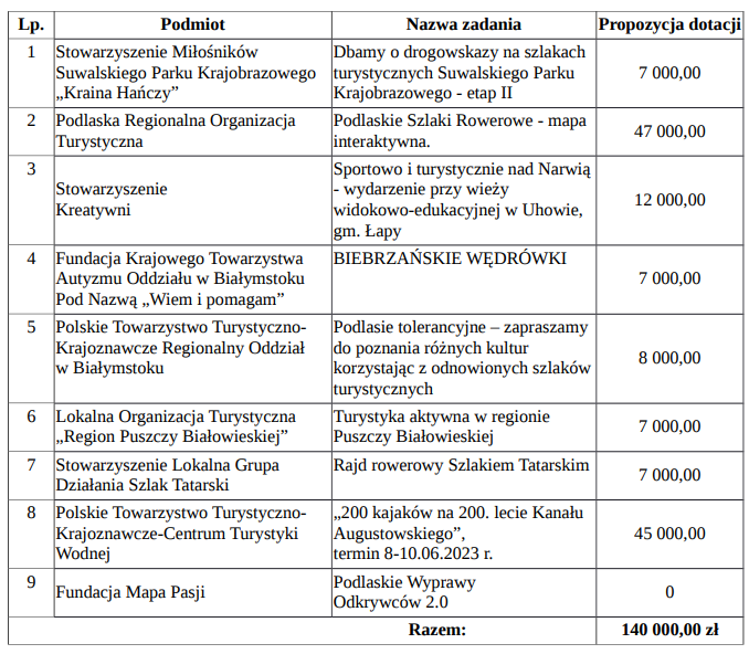 Na konkurs wpÅ‚ynęło 35 ofert, ale 26 z nich nie speÅ‚niÅ‚o wymogów. Natomiast 9 przedsiÄ™wzięć, które byÅ‚y zgodne z kryteriami formalnymi i merytorycznymi, otrzyma dotacjÄ™.