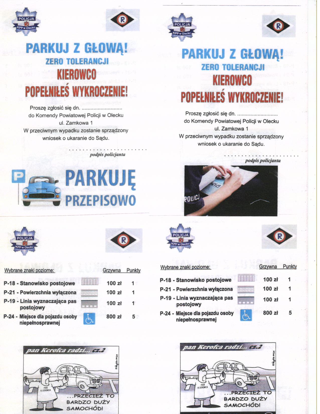 Policjanci z Olecka prowadzą akcję prewencyjną „Parkuj z głową - zero tolerancji”. Kierowcy, którzy nie przestrzegają przepisów, znajdują za wycieraczką swoich samochodów wezwanie na komendę.