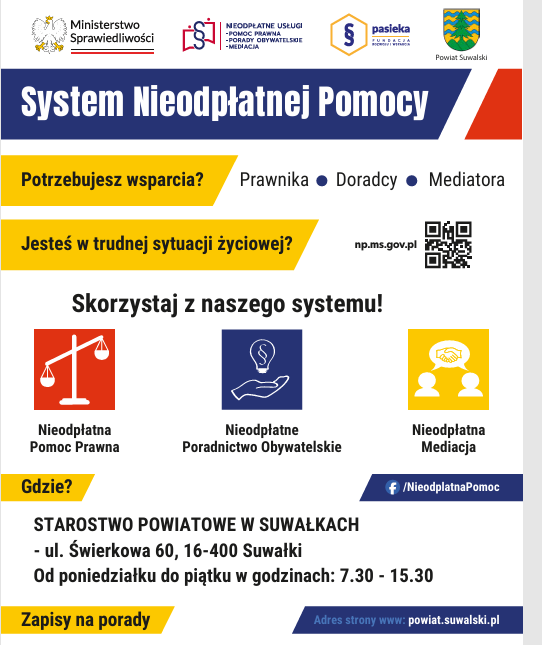 Informujemy, że w Starostwie Powiatowym w SuwaÅ‚kach dziaÅ‚ajÄ… 2 punkty nieodpÅ‚atnej pomocy prawnej i nieodpÅ‚atnego poradnictwa obywatelskiego. Znajdziecie tu PaÅ„stwo profesjonalnÄ… i darmowÄ… pomoc radców prawnych, adwokatów, mediatorów oraz osób zajmujÄ…cych siÄ™ poradnictwem obywatelskim.