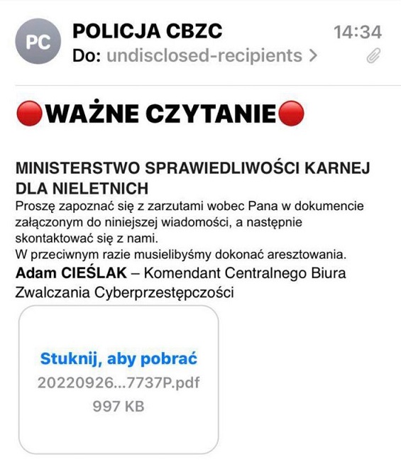 W celu uwiarygodnienia swojej wiadomości przestępcy podpisują się jako Komendant Centralnego Biura Zwalczania Cyberprzestępczości – Adam Cieślak.