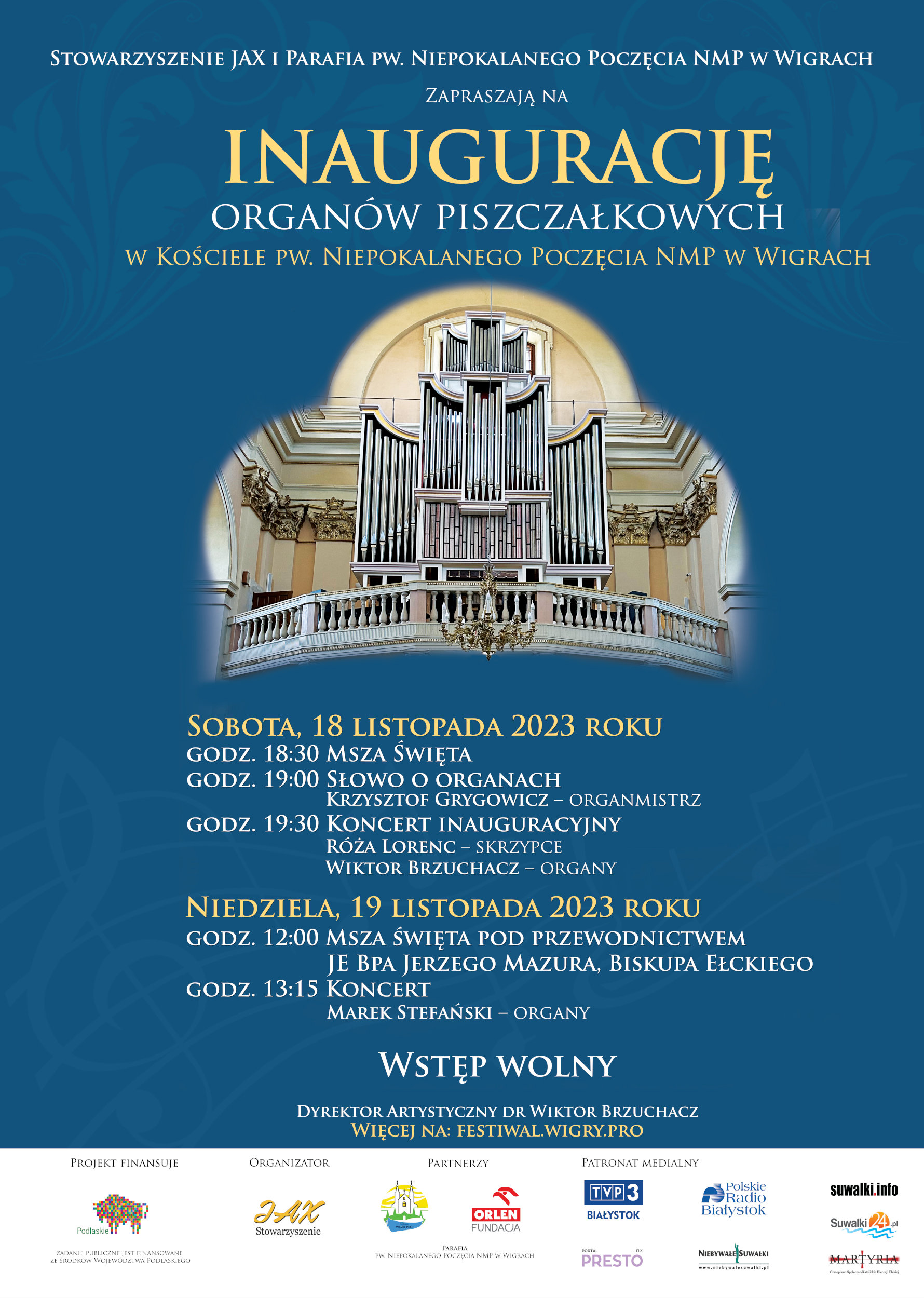 Projekt pod nazwÄ… „Inauguracja organów piszczaÅ‚kowych w KoÅ›ciele pw. Niepokalanego PoczÄ™cia NMP w Wigrach” jest finansowany ze Å›rodków Województwa Podlaskiego. Organizatorem jest Stowarzyszenie JAX, a partnerami zadania sÄ…: Fundacja Wigry Pro, Fundacja Orlen, Parafia pw. Niepokalanego PoczÄ™cia NMP w Wigrach.