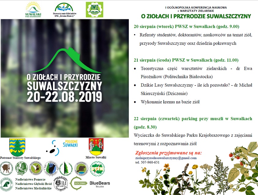 W dniach 20-22 sierpnia w PWSZ w Suwałkach oraz w Suwalskim Parku Krajobrazowym odbędzie się I Ogólnopolska Konferencja Naukowa pt. „O ziołach i przyrodzie Suwalszczyzny" będąca rozszerzeniem drugiej edycji warsztatów zielarskich.