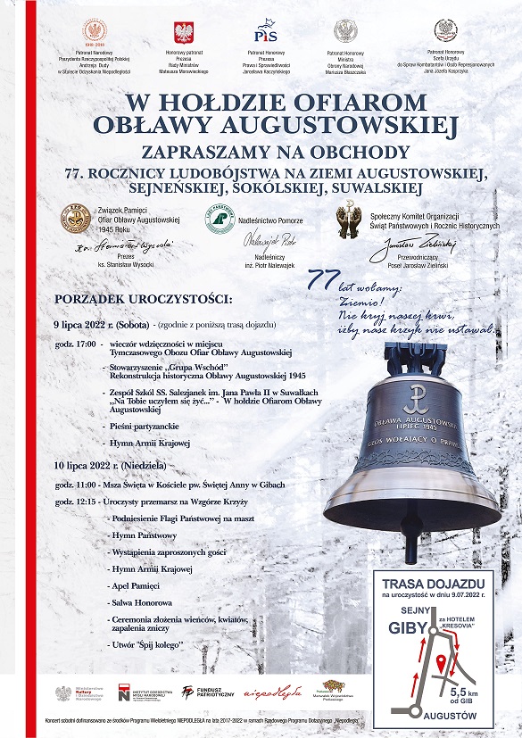 Prezes Związku Pamięci Obławy Augustowskiej z Lipca 1945 Roku ks. Prałat Stanisław Wysocki oraz Społeczny Komitet Organizacji Świąt Państwowych i Rocznic Historycznych, pod przewodnictwem Jarosława Zielińskiego serdecznie zapraszają do udziału w obchodach Dnia Pamięci Ofiar Obławy Augustowskiej.
