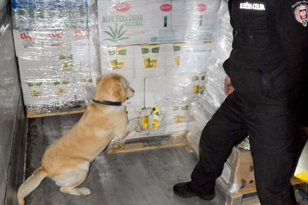 Najpierw funkcjonariusze celni pełniący służbę na drodze krajowej nr 8 zatrzymali do kontroli tira na litewskich numerach rejestracyjnych, załadowanego artykułami spożywczymi. Podczas szczegółowej rewizji ciężarówki służbowy labrador Nero natychmiast drapaniem zaznaczył palety, na których znajdowały się kartony z sokami owocowymi.