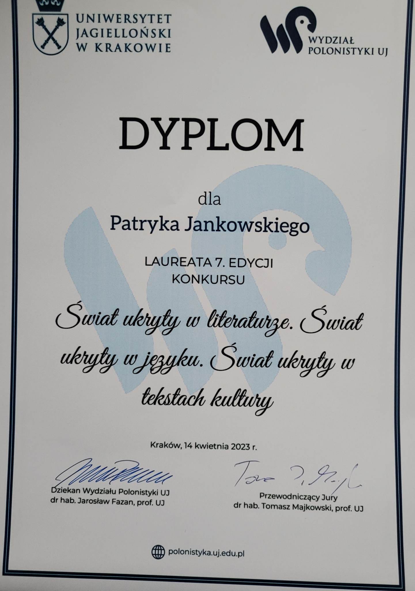 Patryk Jankowski z klasy II ABG Zespołu Szkół Ogólnokształcących w Sejnach laureatem 7. edycji konkursu Wydziału Polonistyki Uniwersytetu Jagiellońskiego "Świat ukryty w literaturze. Świat ukryty w języku. Świat ukryty w tekstach"