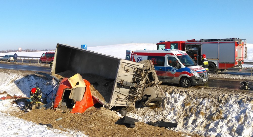 Do wypadku doszło około 13.00. Ze wstępnych ustaleń policjantów wynika, że jadący w kierunku Ełku kierowca samochodu ciężarowego, najprawdopodobniej podczas próby wyprzedzenia innego pojazdu, stracił panowanie nad swoim autem i otarł się o jadący obok samochód, po czym przewrócił się na bok do przydrożnego rowu.