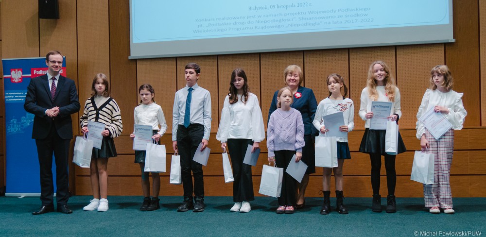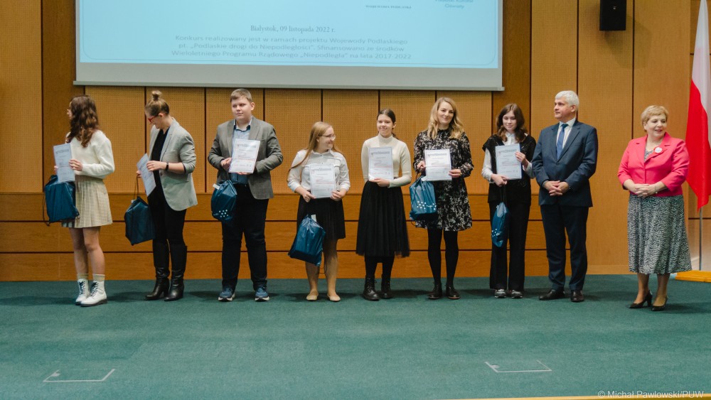 – Konkurs cieszył się wielką popularnością, wpłynęły 834 zgłoszenia. Zsumowany wysiłek uczniów, rodziców, nauczycieli, wychowawców oraz Podlaskiego Kuratorium Oświaty świadczy o niesamowitym zaangażowaniu w ten projekt. Cieszę się, że tak dużo osób skupiliśmy wokół idei konkursu, sprawy niepodległości, najistotniejszej dla naszego życia zbiorowego – podkreślił wojewoda podlaski Bohdan Paszkowski. Jak zaznaczył, gala wręczenia nagród zbiega się z 104. rocznicą odzyskania przez Polskę własnej państwowości. – Żyjemy w wolnym kraju i mamy dług wobec osób walczących o tę wolność oraz zobowiązanie, by dbać o dobro Ojczyzny, pielęgnować pamięć o jej bohaterach oraz przypominać młodym pokoleniom o naszej historii – mówił wojewoda podlaski.
