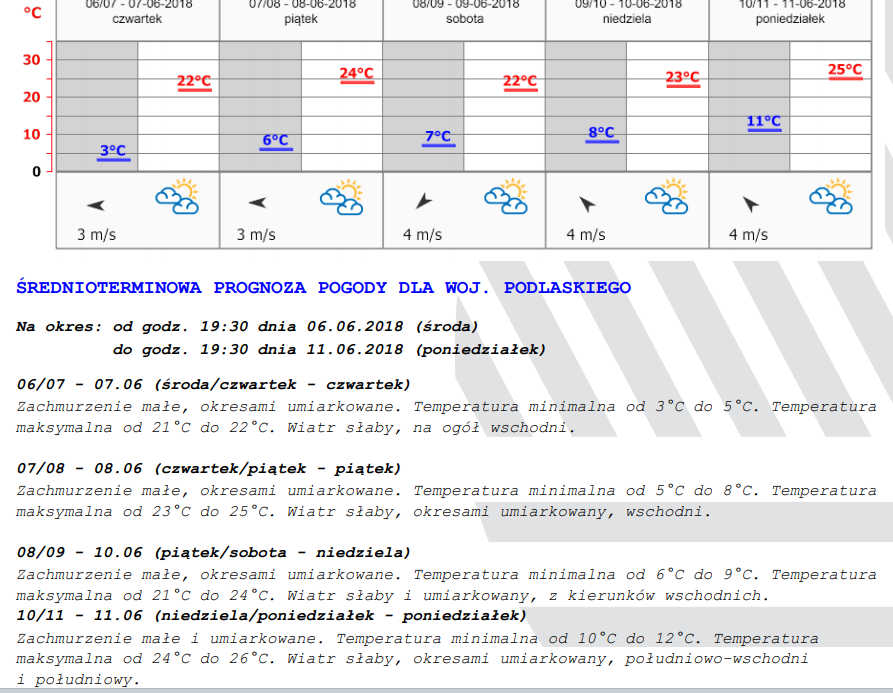 Krótko- i Å›rednioterminowa prognozy pogody, opracowane przez synoptyków biaÅ‚ostockiego biura prognoz IMGW-PIB na pewno nie ucieszÄ… rolników i dziaÅ‚kowców, którzy nie pamietajÄ… tak gorÄ…cych, a zarazem niemal bezdeszczowych tygodni. We wtorek zachmurzenie ma być umiarkowane i duże, ale tylko lokalnie mogÄ… wystÄ…pić sÅ‚abe, przelotne opady deszczu. W Å›rodÄ™ zachmurzenie może już być tylko sÅ‚abe.