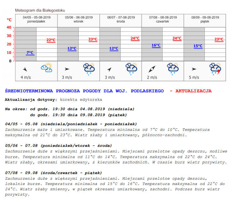 Prognoza na 120 godzin przygotowana przez Instytut Meteorologii i Gospodarki Wodnej - Państwowy Instytut Badawczy Biuro Prognoz Meteorologicznych w Białymstoku: