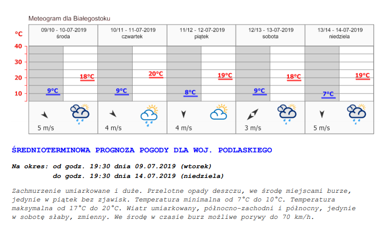 Jak powiadamia Biuro Prognoz Meteorologicznych IMGW-PIB w Białymstoku, w poniedziałek i wtorek prognozuje się wystąpienie burz z opadami deszczu od 5 mm do 10 mm, lokalnie około 20 mm oraz porywami wiatru do 65 km/h. Lokalnie opady gradu.