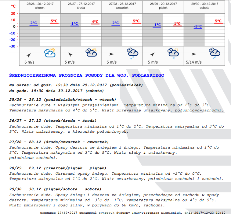 Zachmurzenie duże - tak zaczyna się opracowana przez białostockich synoptyków prognoza na każdy z najbliższych pięciu dni. Nie uświadczymy słońca, oznak prawdziwej zimy zapewne też nie.