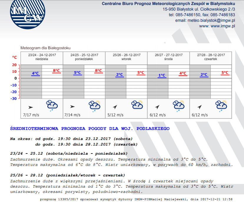 Osiem stopni na plusie w WigiliÄ™ i w pierwszy dzieÅ„ ÅšwiÄ…t Bożego Narodzenia, możliwe opady deszczu. ZresztÄ…, wystarczy zerknąć poniżej, a ku pokrzepieniu dać wiarÄ™ naukowcom, którzy przekonujÄ…, że na zaufanie zasÅ‚ugujÄ… prognozy krótkoterminowe, góra do trzech dni. Te dÅ‚uższe, to jak przepowiednie starego górala ”bÄ™dzie zima, albo nie bÄ™dzie”.