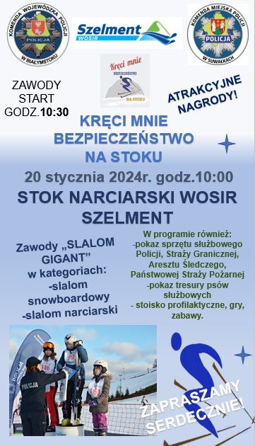 Suwalscy policjanci zapraszają na stok Wojewódzkiego Ośrodka Sportu i Rekreacji w Szelmencie. W najbliższą sobotę zaKręci Nas tam Bezpieczeństwo. W programie między innymi ,,Slalom Gigant", pokaz tresury psów służbowych oraz różne konkursy, mnóstwo śmiechu i zabawy.