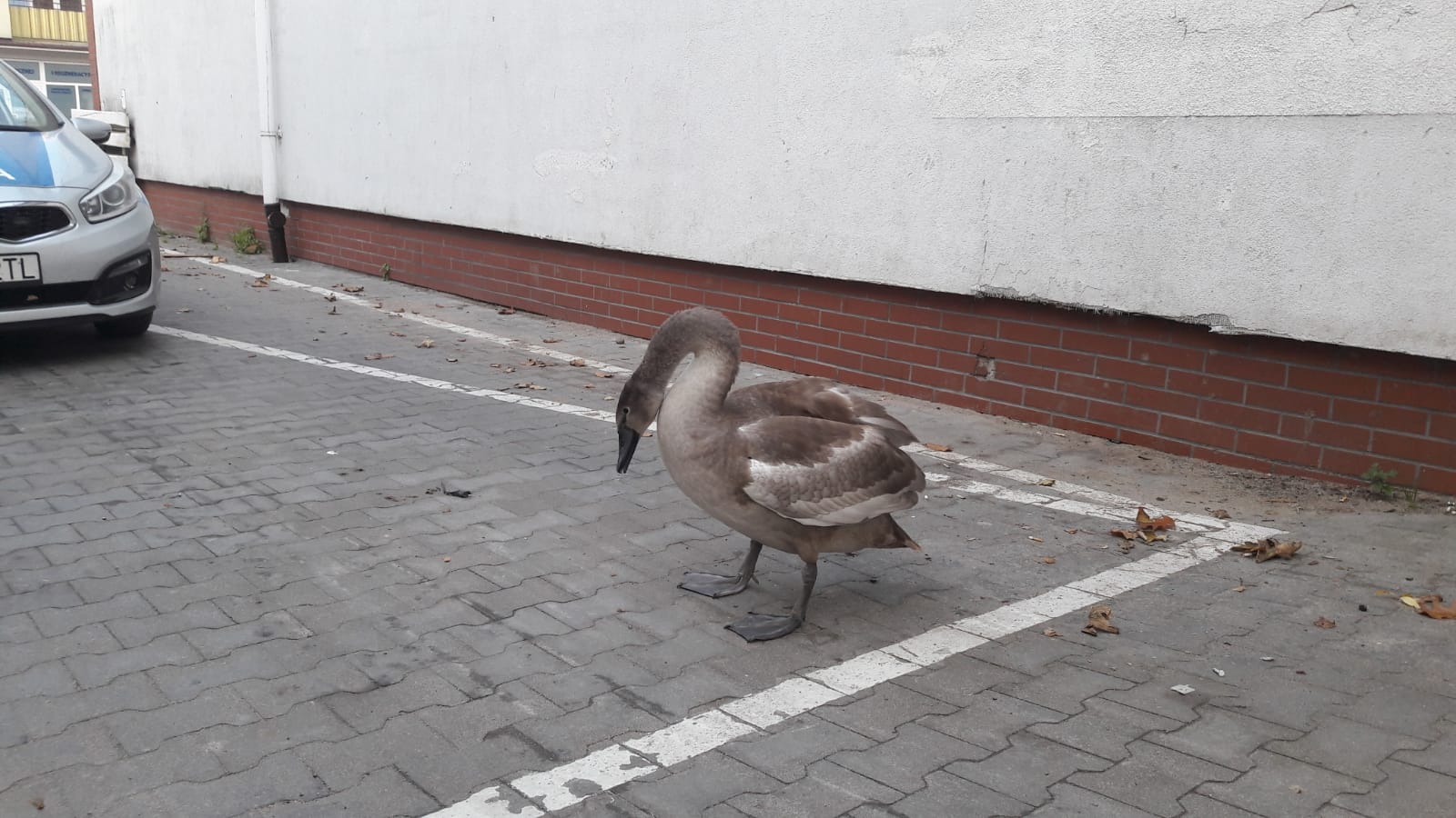 Młody, niespełna roczny łabędź najwyraźniej zabłądził za terenie Gołdapi. Na interwencję wezwał zaniepokojony mieszkaniec widzący błąkającego się po centrum miasta ptaka.