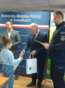 W podsumowaniu konkursu plastycznego pt. „Moje bezpieczne ferie zimowe 2023" wręczając dyplomy i nagrody uczestniczyli: p. Witold Kowalewski - Starosta Suwalski, p. Daniel Racis - Prezes Wojewódzkiego Ośrodka Sportu i Rekreacji "Szelment" oraz zastępca Komendanta Miejskiego Policji w Suwałkach młodszy inspektor Daniel Szymanowicz.