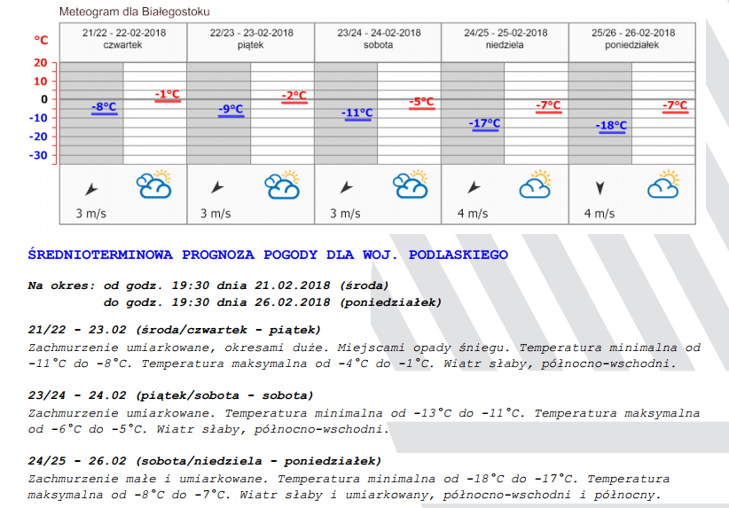 WedÅ‚ug synoptyków z biaÅ‚ostockiego biura prognoz IMGW-PIB przed nami lekkie opady Å›niegu i stopniowe obniżka temperatury. Najpierw w nocy bÄ™dzie -11°C, a w ostatni weekend lutego, z soboty na niedzielÄ™ i z niedzieli na poniedziaÅ‚ek termometry pokażą nawet -18°C.