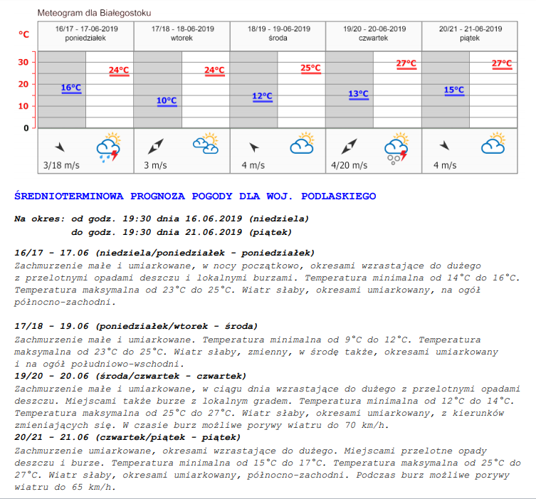 W niedzielÄ™ zachmurzenie umiarkowane i duże. Przelotne opady deszczu, miejscami burze z możliwym gradem. Prognozowana wysokość opadów podczas burz, lokalnie do 35 mm.Temperatura maksymalna od 27°C do 29°C. Wiatr sÅ‚aby, okresami umiarkowany, z kierunków zmieniajÄ…cych siÄ™. W czasie burz możliwe porywy wiatru do 80 km/h.