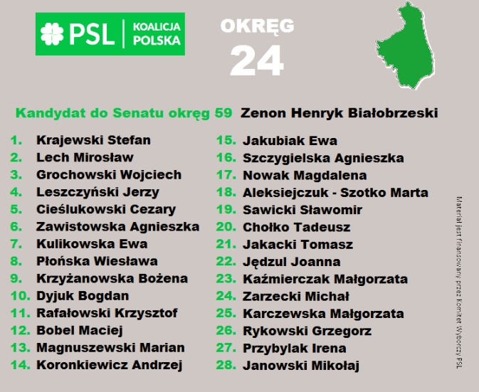 PSL Koalicja Polska wystawia swojego kandydata do Senatu w naszym, Å‚omżyÅ„sko-suwalskim okrÄ™gu nr 59. Jest nim Zenon Henryk BiaÅ‚obrzeski, wójt gminy Zbójna, uzgodniony z KoalicjÄ… ObywatelskÄ… i LewicÄ….