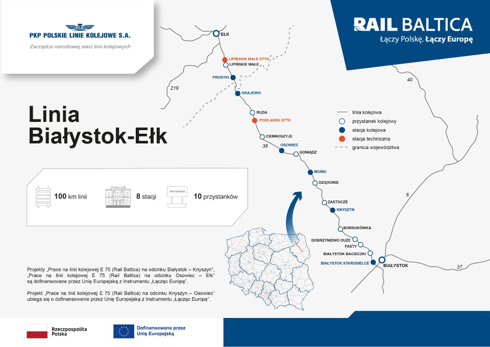 - projekty „Prace na linii kolejowej E 75 (Rail Baltica) na odcinku Białystok – Knyszyn", „Prace na linii kolejowej E 75 (Rail Baltica) na odcinku Osowiec – Ełk" są już dofinansowane przez Unię Europejską z Instrumentu CEF „Łącząc Europę";