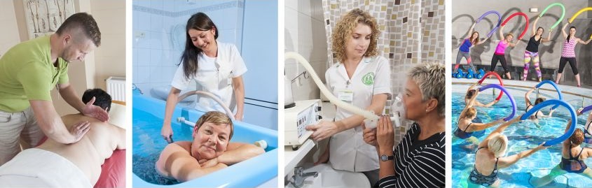 - różne formy rehabilitacji ruchowej, czyli ćwiczenia indywidualne i grupowe, ćwiczenia w wodzie oraz zabiegi fizykoterapeutyczne z zakresu ciepłolecznictwa, krioterapii, hydroterapii, światłolecznictwa, magnetoterapii, leczenia ultradźwiękami, a także masażu,