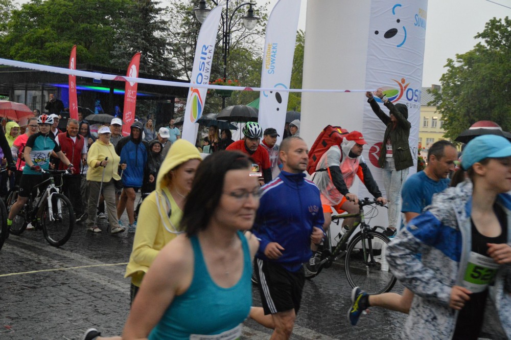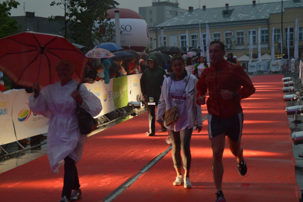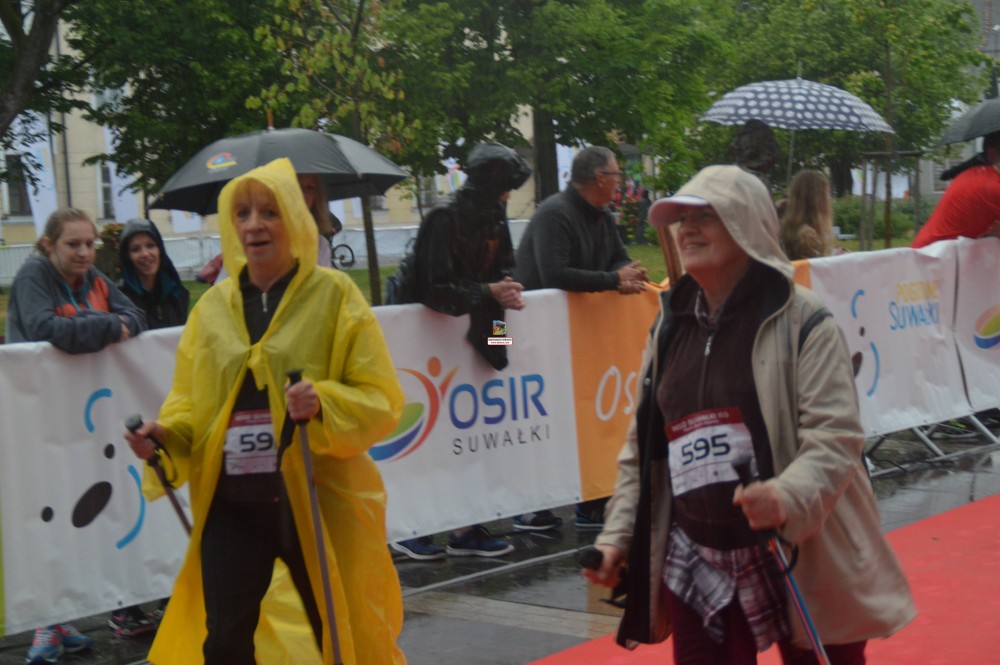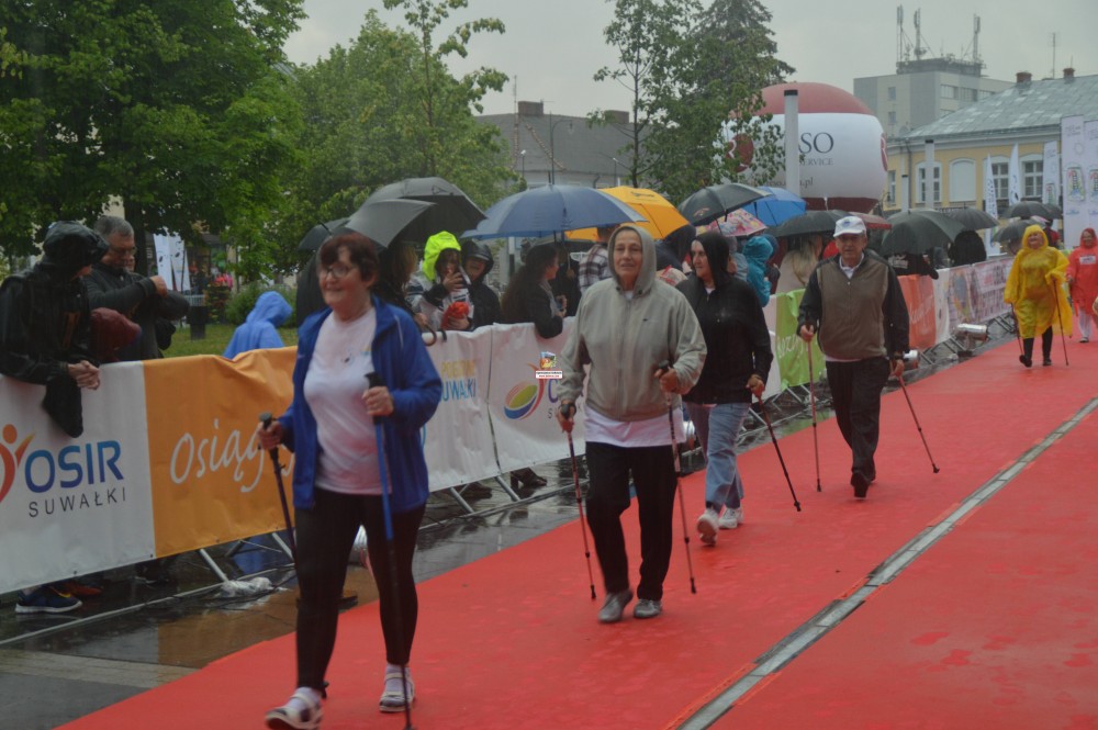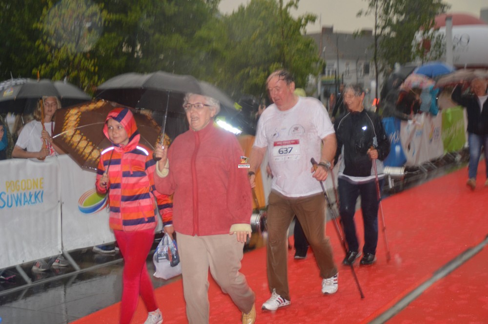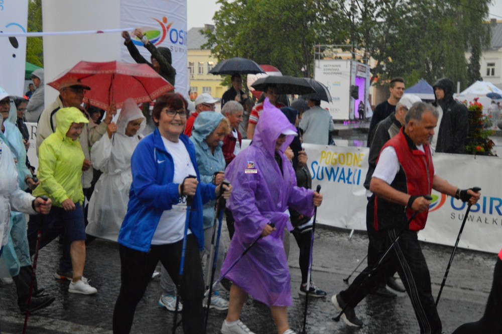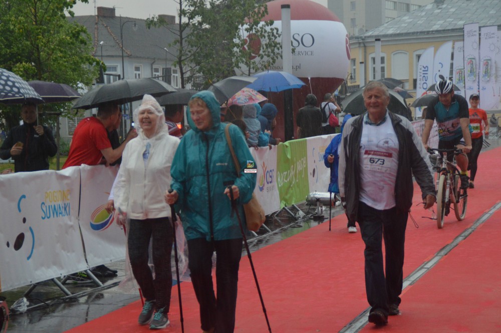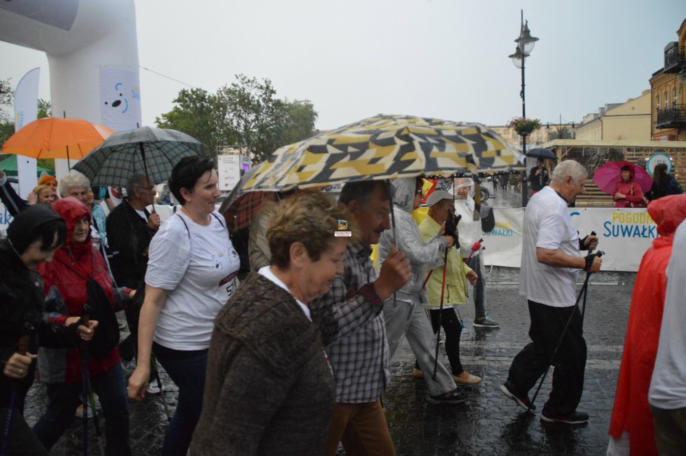 Pecha mieli uczestnicy wyznaczonego na godz. 20.00 biegu na 3,5 kilometra - Suwalskie Debiuty. Blisko stu biegaczy i drugie tyle towarzyszących im w Suwalskim Marszu im z kijkami nordic walking emerytów zmoczył deszcz.