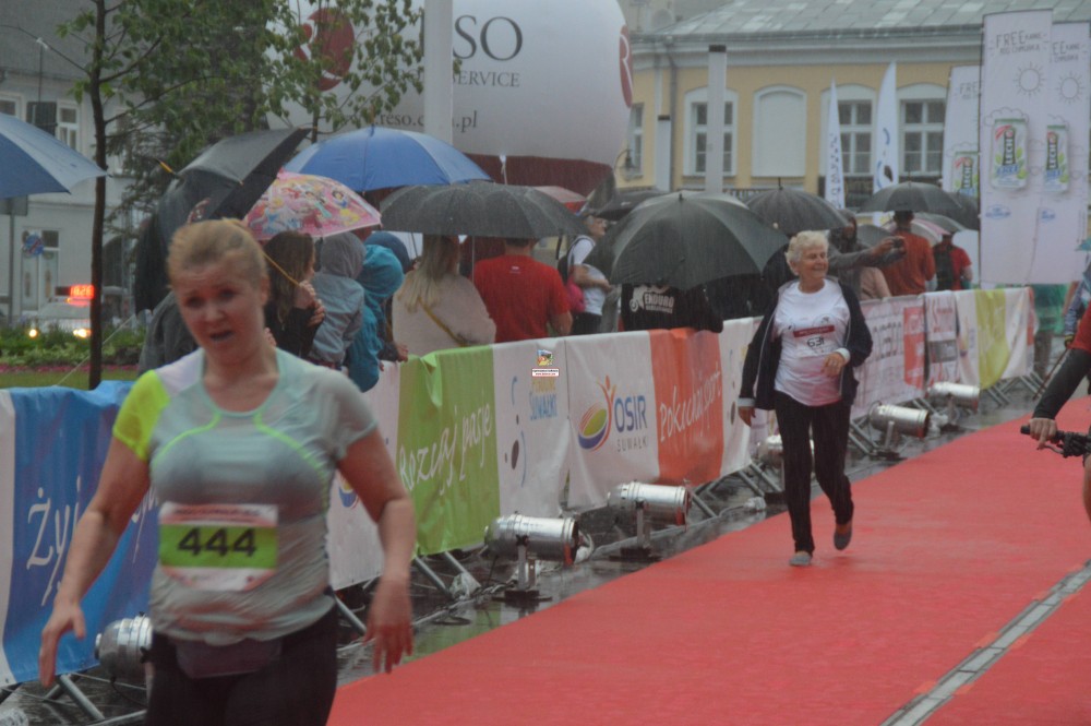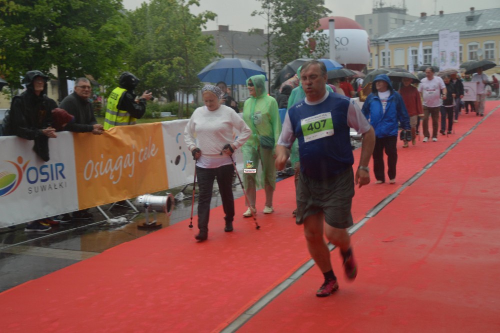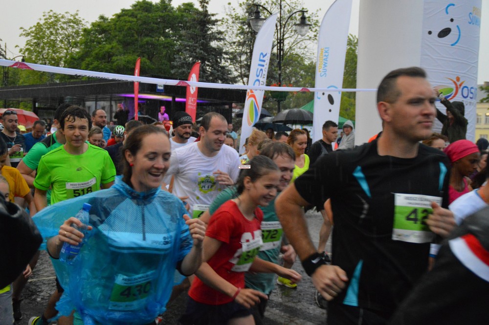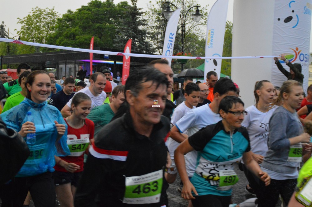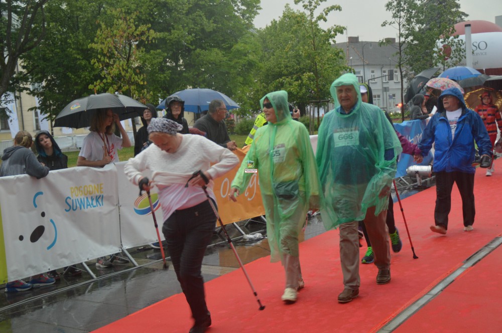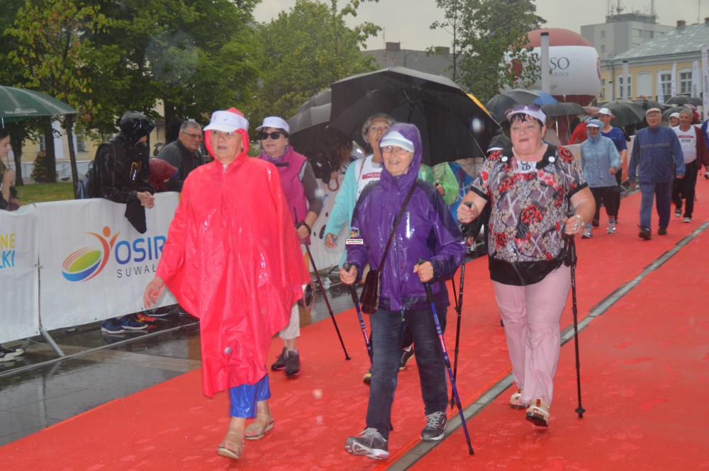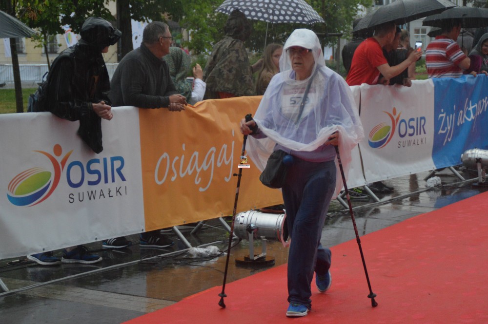 Pecha mieli uczestnicy wyznaczonego na godz. 20.00 biegu na 3,5 kilometra - Suwalskie Debiuty. Blisko stu biegaczy i drugie tyle towarzyszących im w Suwalskim Marszu im z kijkami nordic walking emerytów zmoczył deszcz.