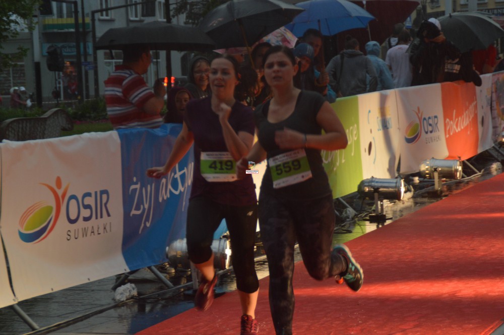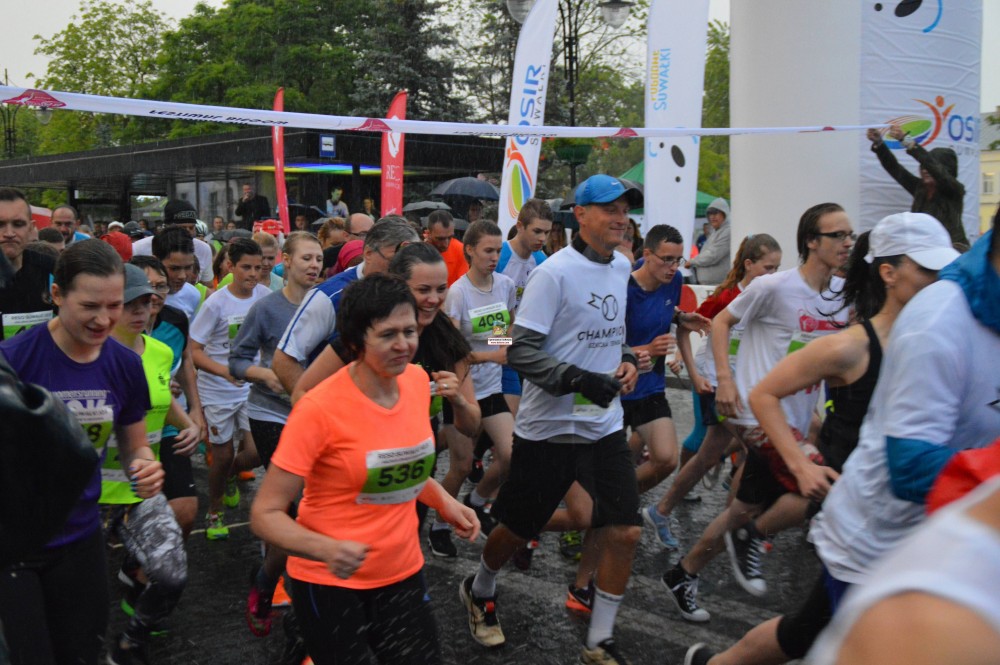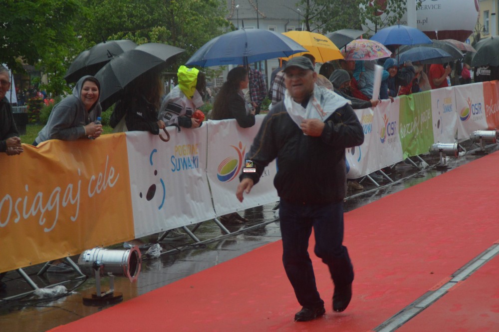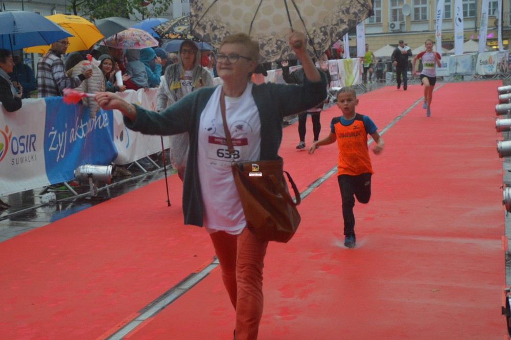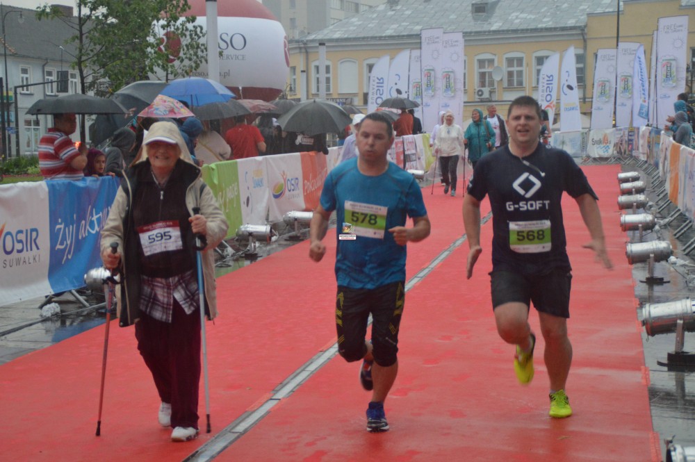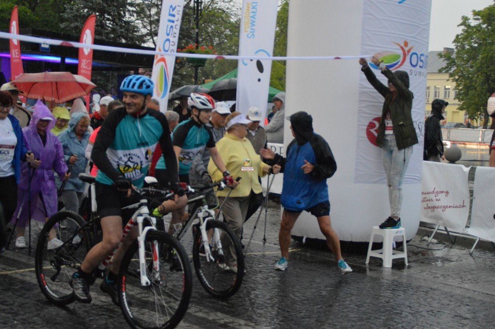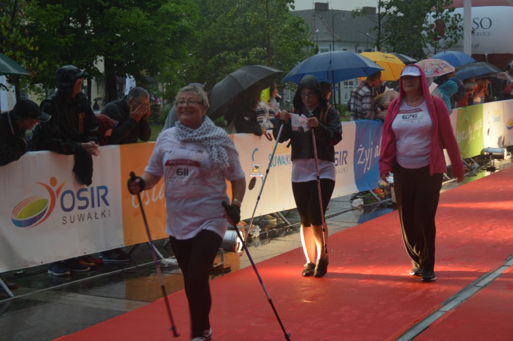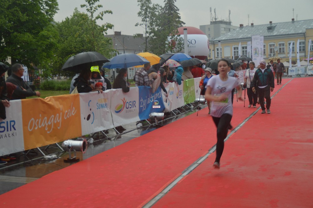 Pecha mieli uczestnicy wyznaczonego na godz. 20.00 biegu na 3,5 kilometra - Suwalskie Debiuty. Blisko stu biegaczy i drugie tyle towarzyszących im w Suwalskim Marszu im z kijkami nordic walking emerytów zmoczył deszcz.